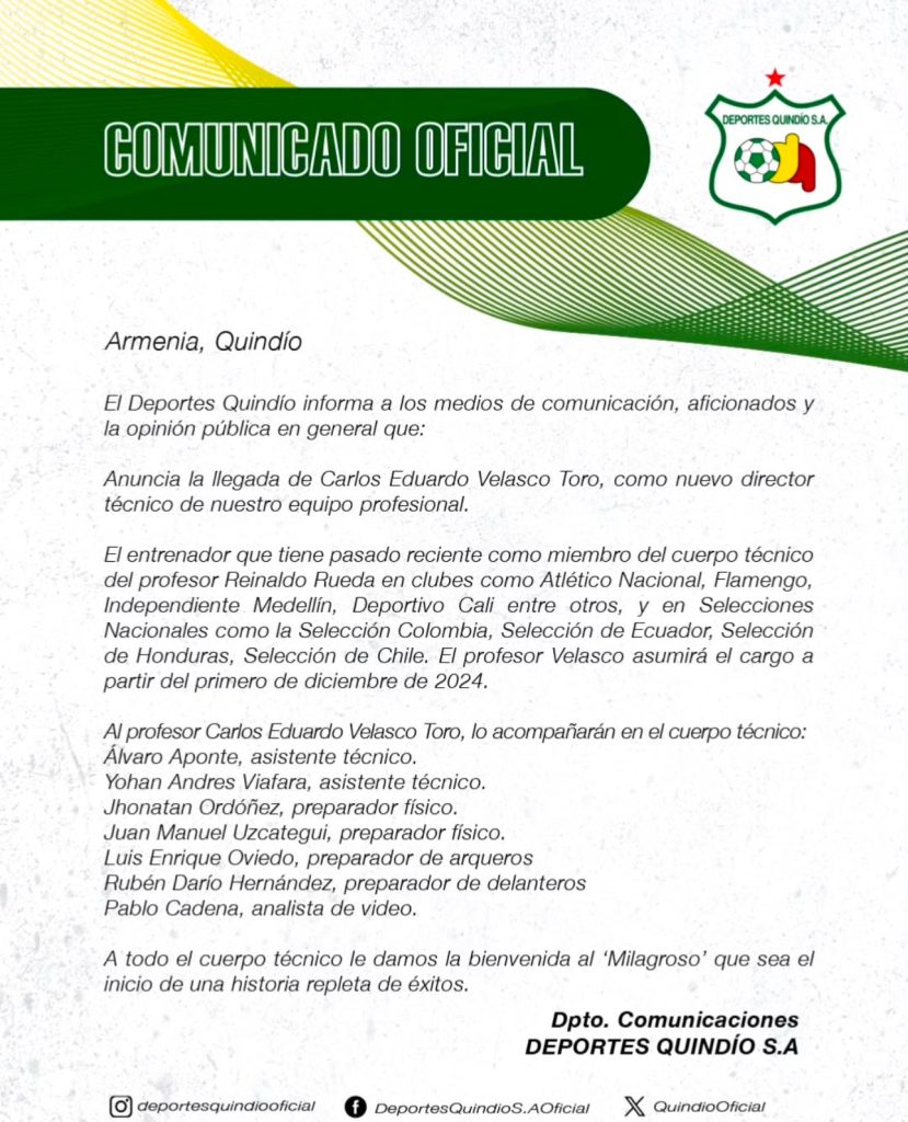 El Deportes Quindío anunció la llegada de Carlos Eduardo Velasco Toro como nuevo director técnico de su equipo profesional. Velasco, reconocido por su amplia trayectoria y experiencia en el fútbol nacional e internacional, asumió el cargo a partir del 1 de diciembre de 2024, liderando los retos del equipo en el Torneo BetPlay Dimayor 2025.