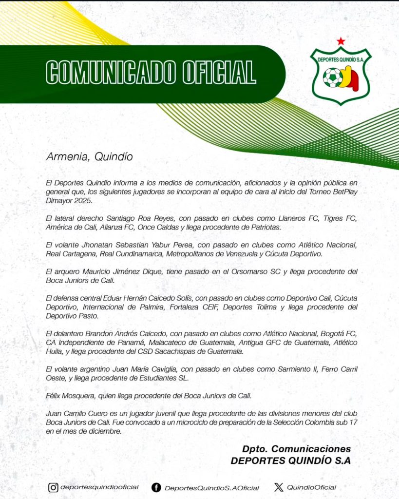 El Deportes Quindío da la bienvenida a un grupo de nuevos jugadores que aportarán talento y experiencia al equipo: