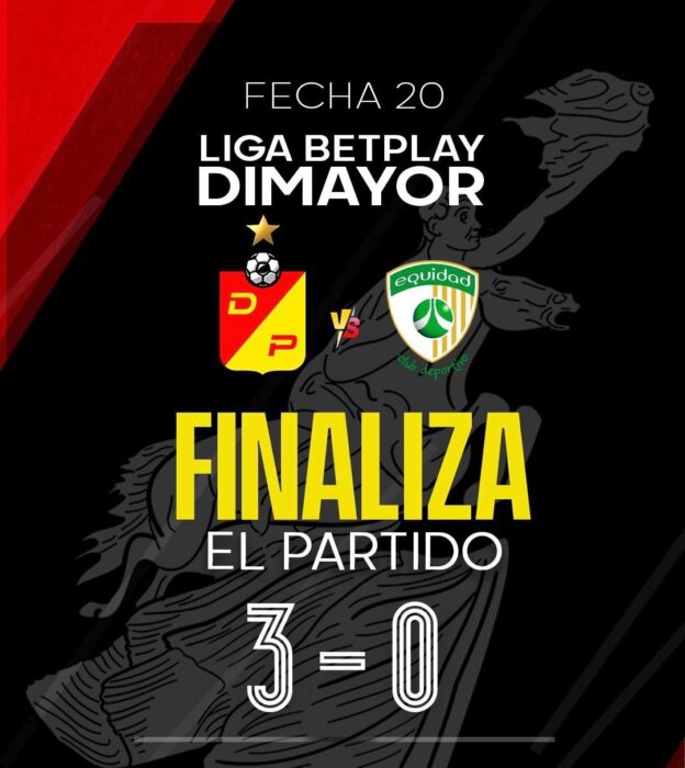 Con goles de Carlos Darwin Quintero a los 6 minutos, de Yúber Quiñones a los 31 y de Gianfranco Peña a los 93, el Deportivo Pereira le ganó en condición de local, a la escuadra de Equidad, 3 goles por 0 y cerró así su participación en la Liga BetPlay Dimayor 2025-I.