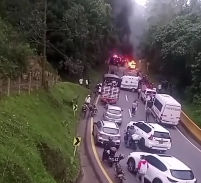 En la mañana de este sábado, la vía La Línea (sentido Calarcá–Cajamarca y viceversa) permanece cerrada debido al incendio de una buseta ocurrido cerca del peaje del Quindío, en plena oleada de viajeros por el puente festivo de San Pedro.