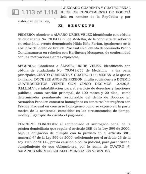 La Jueza 44 Penal de Bogotá, Sandra Heredia, dio a conocer hoy la sentencia a 12 años de prisión en contra del expresidente Uribe.