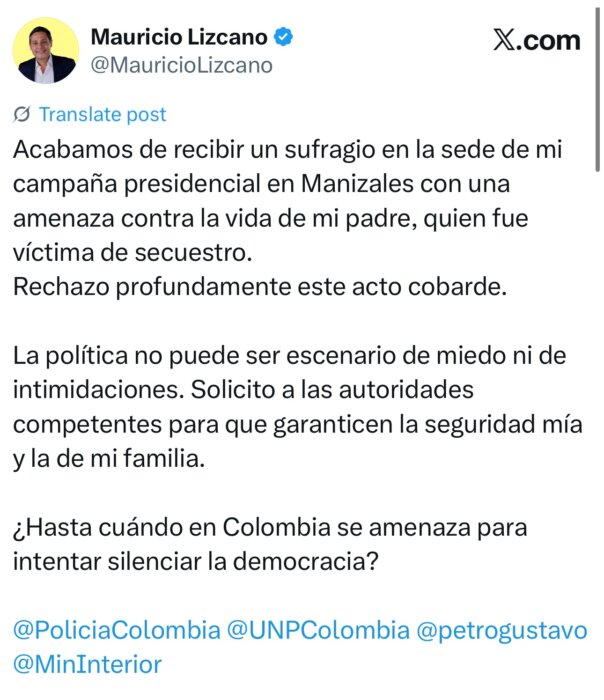 El precandidato Mauricio Lizcano alertó sobre una amenaza dirigida a su padre, el excongresista Óscar Tulio Lizcano, luego de que su equipo de campaña recibiera un sufragio intimidante en la sede política de Manizales.