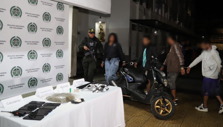 La operación se desarrolló en la vereda El Jardín, en Villamaría, Caldas, donde las autoridades hicieron efectivas cuatro órdenes judiciales contra alias “Fénix”, “Mechas”, “Camila” y “Brandon”, quienes registran antecedentes por homicidio, tráfico de drogas, porte ilegal de armas y secuestro. Durante el allanamiento, fueron incautados dos revólveres, una escopeta recortada, nueve celulares, 500 gramos de marihuana y dos motocicletas.