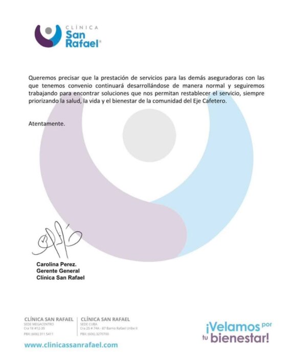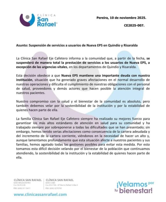 La Clínica San Rafael anunció la suspensión temporal de los servicios a los usuarios afiliados a la Nueva EPS en los departamentos de Risaralda y Quindío, debido a las millonarias deudas que esta entidad mantiene con su red de prestadores.