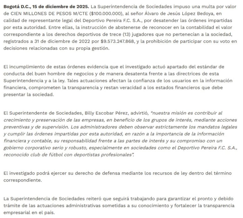 La superintendencia, en un comunicado divulgado este lunes, dice que Álvaro López Bedoya, presidente y máximo accionista del Deportivo Pereira, no cumplió las órdenes que le prohíben votar en decisiones relacionadas con su gestión y la abstención de reconocer en la contabilidad el valor correspondiente a los derechos deportivos de 13 jugadores que no pertenecían a la sociedad. Estos comportamientos, agrega la Súper, atentan contra el estándar de conducta del buen hombre de negocios y deja una sensación de desconfianza respeto a la información financiera del club.