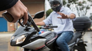 Una cámara de seguridad registró el momento en que dos sujetos que se movilizaban en una motocicleta interceptaron a otro motociclista y, bajo amenazas con un arma de fuego apuntada a la cabeza, lo despojaron de su vehículo.