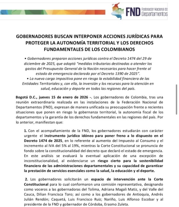 Los gobernadores del país anunciaron, este 15 de enero de 2026, que no acatarán el decreto de emergencia económica expedido por el presidente Gustavo Petro y que cada uno presentará una acción de tutela para impugnarlo ante la justicia.