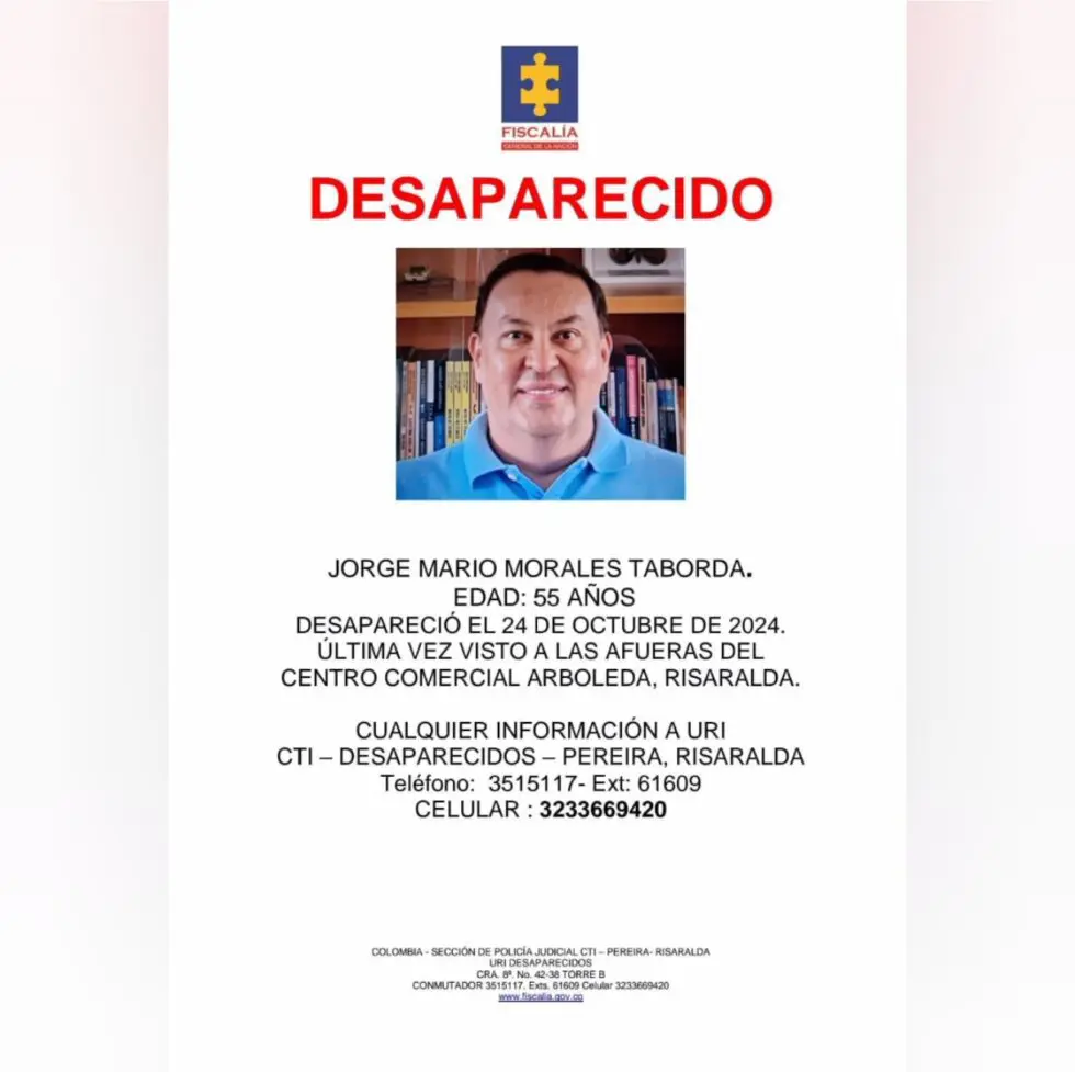 La víctima fue identificada como Jorge Mario Taborda, directivo docente y exgerente de Chevrolet Caminos, cuya desaparición fue reportada en octubre de 2024, luego de que saliera de una entidad bancaria en la capital risaraldense.