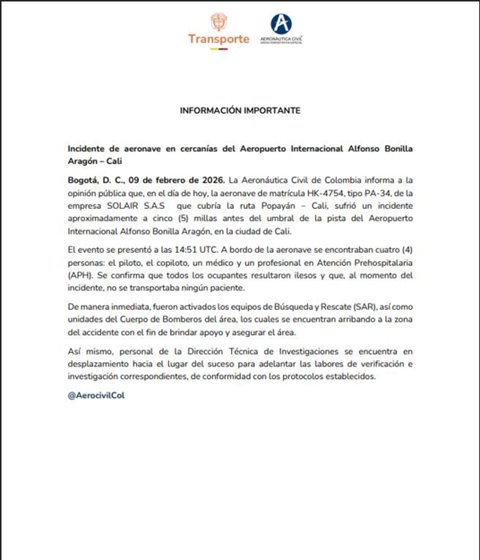 La Aeronáutica Civil confirmó que la aeronave, una PA-34 matrícula HK-4754 de la empresa SOLAIR S.A.S., despegó a las 9:22 a. m. y sufrió la emergencia apenas 28 minutos después. Gracias a la pericia del piloto, los cuatro ocupantes —piloto, copiloto, un médico y un profesional en Atención Prehospitalaria— lograron sobrevivir sin lesiones graves.