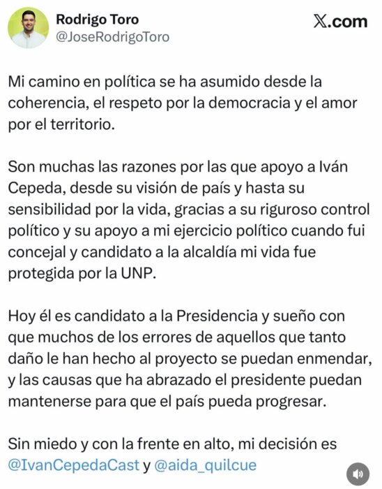 El excandidato a la Cámara de Representantes por Risaralda y exalcalde de Santa Rosa de Cabal, Rodrigo Toro, anunció su respaldo al candidato presidencial Iván Cepeda.