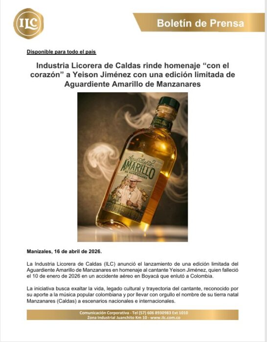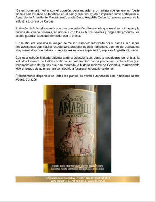 La Industria Licorera de Caldas anunció el lanzamiento de una edición limitada de Aguardiente Amarillo de Manzanares como homenaje póstumo al cantante Yeison Jiménez.