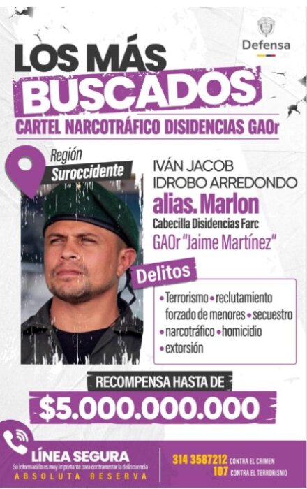 De acuerdo con las autoridades, alias ‘Marlon’ estaría vinculado a la planificación y ejecución de los ataques que han afectado el orden público en estas zonas, motivo por el cual se intensifican las acciones operativas para dar con su paradero.